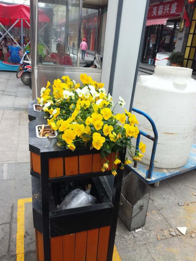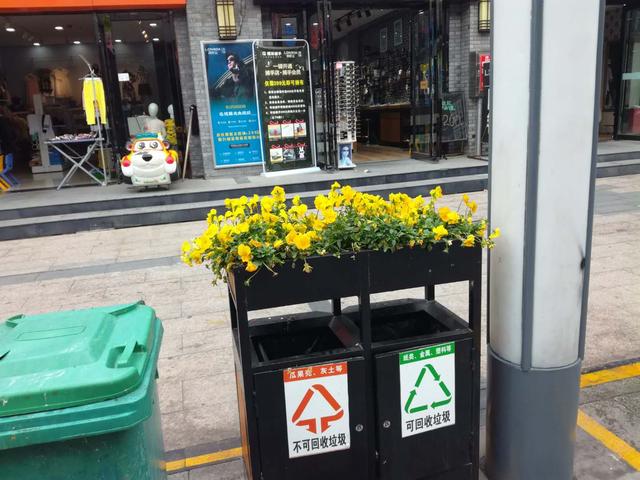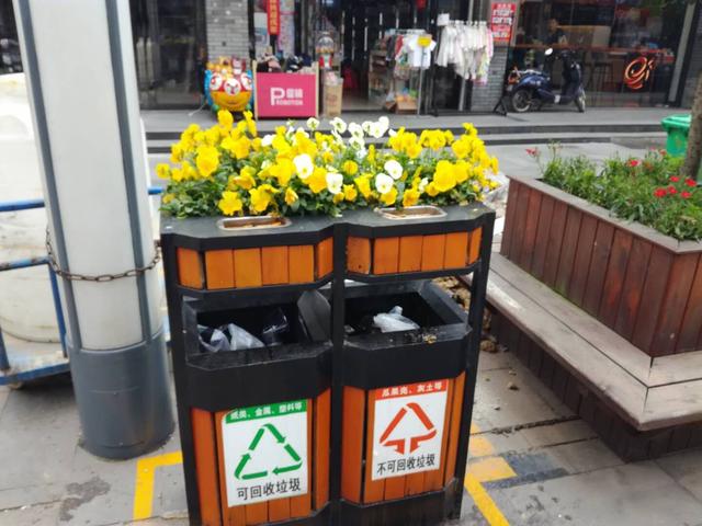 環(huán)衛(wèi)分類垃圾桶上栽花,成為城市風(fēng)景線