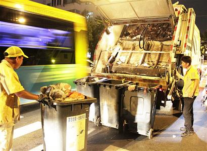 9月18日晚8時許,唐前和將裝有廚余垃圾的綠色垃圾桶和裝有其它垃圾的灰色垃圾桶分別推到馬路兩側(cè),一輛垃圾收運車將灰色垃圾桶的垃圾運走,大約一個小時后,運輸廚余垃圾的車輛將路邊綠色垃圾桶的垃圾運走。隨后,唐前和再將空桶推回到各個居民樓下。?