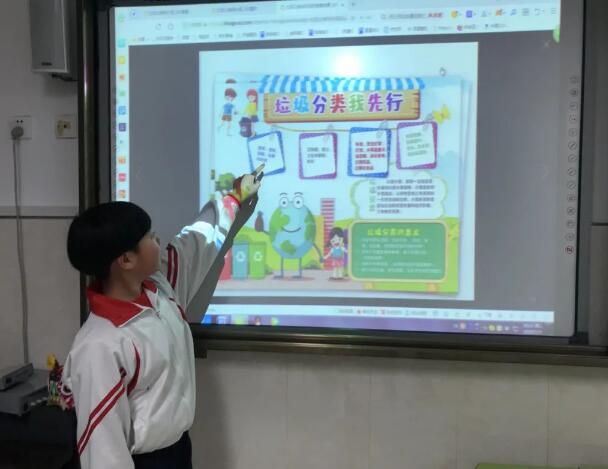 在手抄報(bào)制作開始前,老師以“什么是垃圾分類”這個(gè)問題為開頭開始今天的活動(dòng),先讓學(xué)生們回答這個(gè)問題。“垃圾分類就是按照豬吃不吃來(lái)分的”,其中一個(gè)學(xué)生的回答把老師和其他學(xué)生都逗笑了。緊接通過(guò)視頻和老師的講解展示了垃圾分類的類型,之后老師給每位同學(xué)發(fā)了兩張小卡片,卡片上有各種垃圾圖案,讓學(xué)生以小火車的方式上來(lái)把小卡片貼在正確的垃圾桶標(biāo)志內(nèi)。