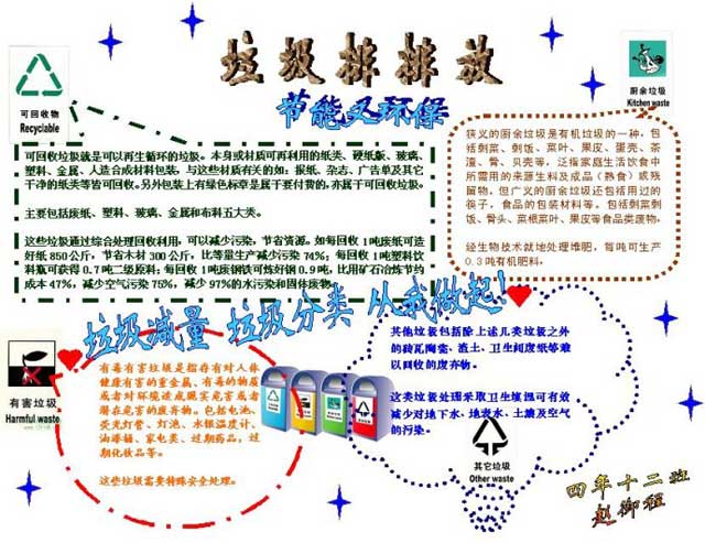 ? ? 我國是世界垃圾最大生產(chǎn)國,但是垃圾處理效果卻落后于大部分國家。對(duì)于垃圾來說,無論哪種處理方式都會(huì)對(duì)環(huán)境產(chǎn)生危害,增加社會(huì)負(fù)擔(dān),造成資源浪費(fèi)。所以解決垃圾處理問題的最好辦法就是,改變生活方式,減少垃圾制造。于此,垃圾分類宣傳必不可少,以下是學(xué)生常用的環(huán)保垃圾分類手抄報(bào),可以幫助學(xué)生理解生活垃圾分類的知識(shí)與現(xiàn)狀。