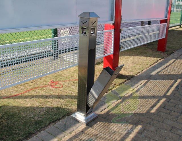 C633-1廠家定制滅煙柱采用優(yōu)質(zhì)不銹鋼剪切、組裝、焊接、絲印而成,它包括外套管、支座、內(nèi)套管、煙灰盒、底座。外套管的底端固定連接在支座上,外套管的側(cè)壁上設(shè)有煙蒂置入口,內(nèi)套管用于集中收納從外套管的煙蒂置入口投入的煙蒂,內(nèi)套管設(shè)在外套管的內(nèi)管腔中,內(nèi)內(nèi)套管的開(kāi)口端朝上,煙蒂置入口與內(nèi)套管的開(kāi)口相連通,以使得從煙蒂置入口投入的煙蒂可從內(nèi)套管的開(kāi)口端落入到內(nèi)套管的內(nèi)管腔中;