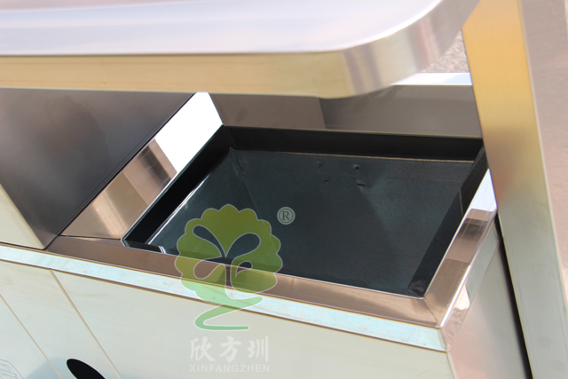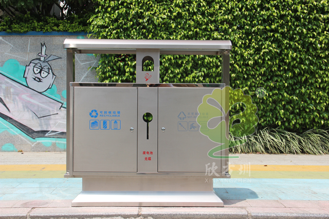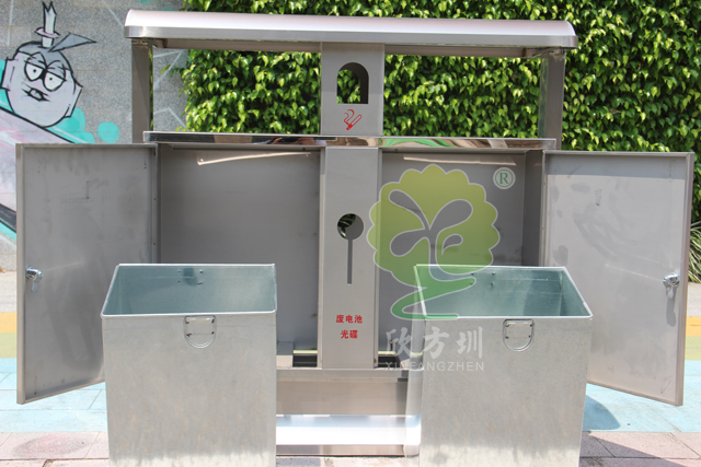 不銹鋼戶外街道分類垃圾桶型號XFZ-C188,規(guī)格1000*360*1000,工廠專業(yè)工人經(jīng)過剪板、折彎、焊接、打磨、噴塑、組裝工序,使桶身光滑亮麗,堅固耐用,防火防銹。