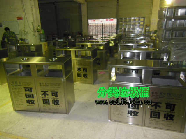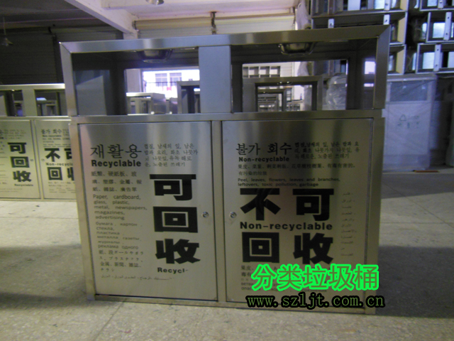 機(jī)場(chǎng)不銹鋼分類垃圾桶型號(hào)xfz-c313,規(guī)格1000*400*900mm,能滿足機(jī)場(chǎng)人流量高度密集而產(chǎn)生的大量零碎垃圾,其外表簡(jiǎn)潔大方、富有金屬光澤,突顯出高貴大方的同時(shí)更加耐臟,桶內(nèi)置鍍鋅內(nèi)膽,方便取出替換清潔,保證垃圾桶及其周圍不會(huì)因?yàn)槔鴼埩舳a(chǎn)生臭味和細(xì)菌?;y是根據(jù)客戶要求定制的多種語(yǔ)言的垃圾分類標(biāo)識(shí),無(wú)論是哪個(gè)國(guó)家的游客看到,都能理解垃圾應(yīng)該怎么扔,深度契合了機(jī)場(chǎng)的文化定位內(nèi)核。此款垃圾桶能很好的襯托出擺放環(huán)境的檔次與品味,深受客戶喜歡。