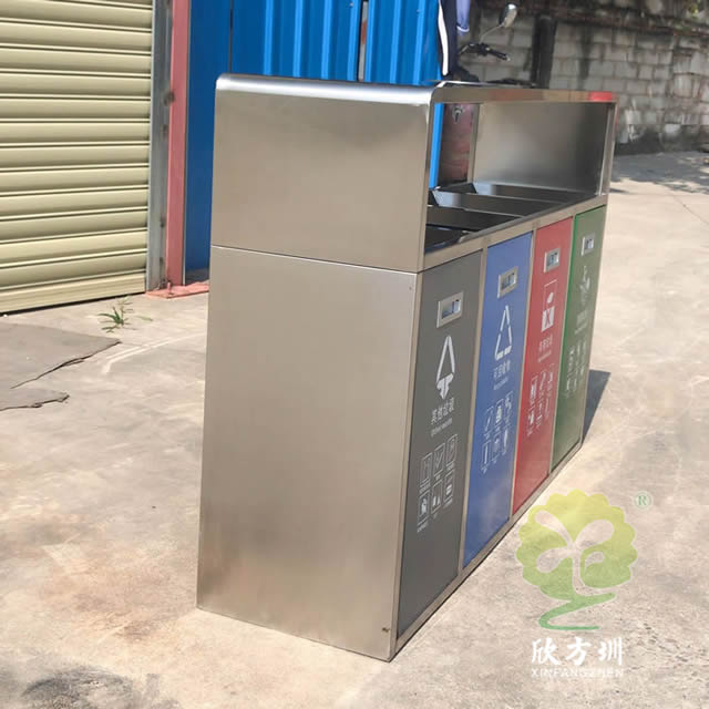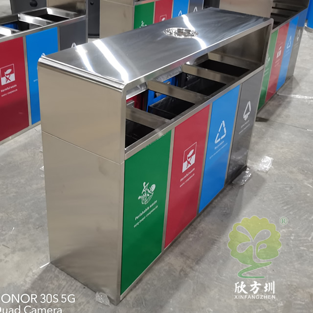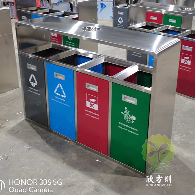 戶外連體四色不銹鋼分類垃圾桶可以選用201/304不銹鋼板制作,戶外方形四分類設(shè)計,正面門板采用了磁吸式下拉開門可以取出內(nèi)筒,四個門板使用了四種噴塑顏料上色,噴塑了灰色、藍(lán)色、紅色、綠色絲印對應(yīng)的國家最新分類標(biāo)識,開料前期頂部可以選擇性需不需要煙灰盅,可以定制兩分類、三分類、五分類的這款垃圾箱。不銹鋼連體垃圾桶是欣方圳設(shè)計生產(chǎn)的一款經(jīng)典熱銷垃圾桶,這款垃圾桶雖然使用不喜歡制作而成,但是外形采用了方形分類,使其看起來有一股自然大方氣質(zhì),特別適合各種歷史景區(qū)、戶外公園、別墅小區(qū)、學(xué)校廣場等場景使用。這款垃圾桶外表經(jīng)過防腐工藝處理,防水防腐蝕、經(jīng)久耐用、工藝精湛、物美價廉。如果你對這款垃圾桶感興趣,請直接聯(lián)系我們報價。