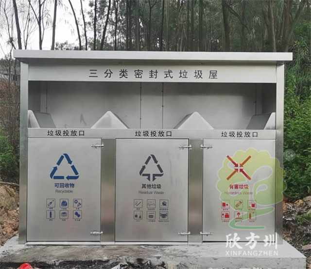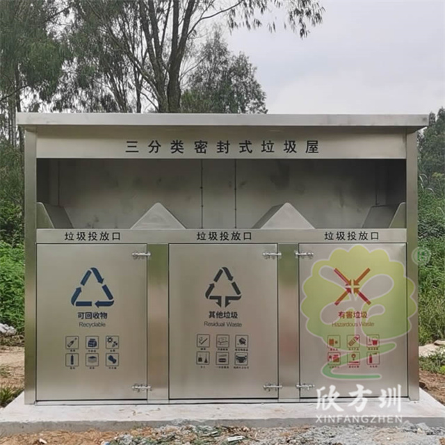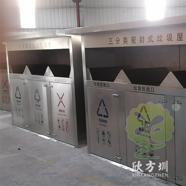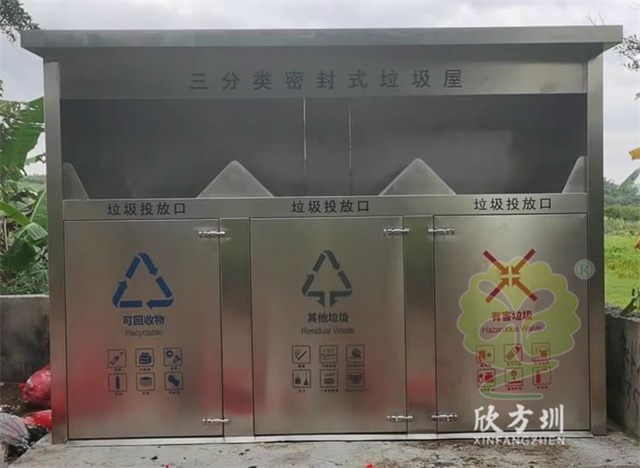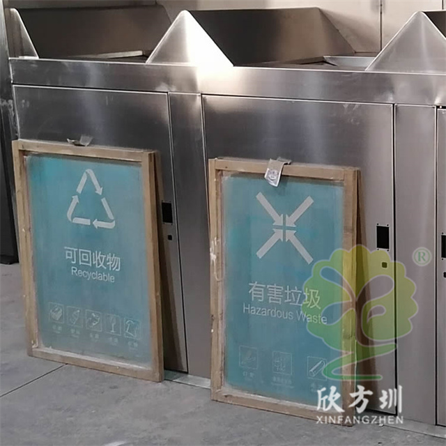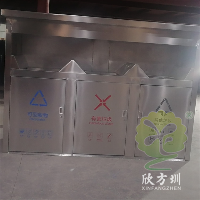 戶(hù)外城鎮(zhèn)密閉式三連體不銹鋼分類(lèi)垃圾桶桶身采用優(yōu)質(zhì) 201#不銹鋼 1.0mm 厚度生產(chǎn)的,戶(hù)外連體三分類(lèi)屋形設(shè)計(jì),絲印單色的分類(lèi)標(biāo)識(shí),可回收物藍(lán)色油墨,有害垃圾紅色油墨,其他垃圾黑色油墨,頂部和投口都采用了油墨絲印了黑色名稱(chēng)標(biāo)識(shí),箱體不帶里面的塑料內(nèi)筒,內(nèi)筒是使用常規(guī)240L塑料垃圾桶。