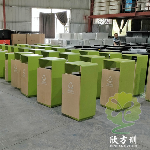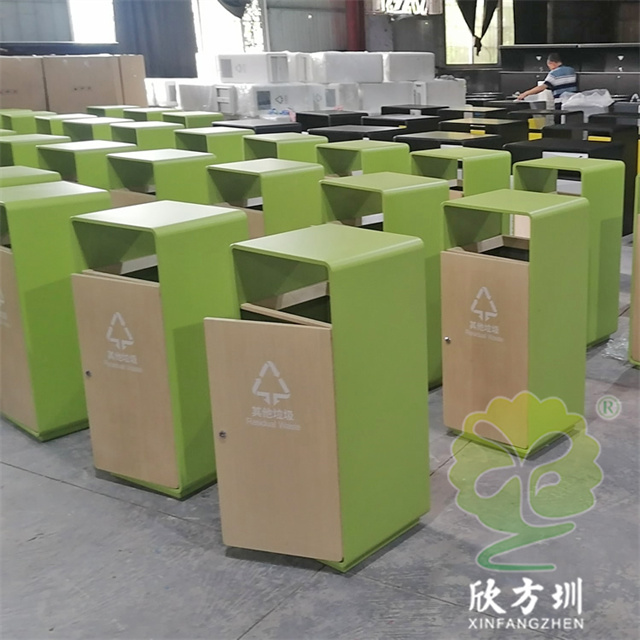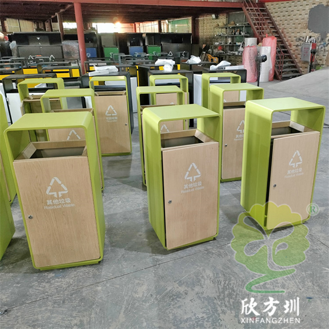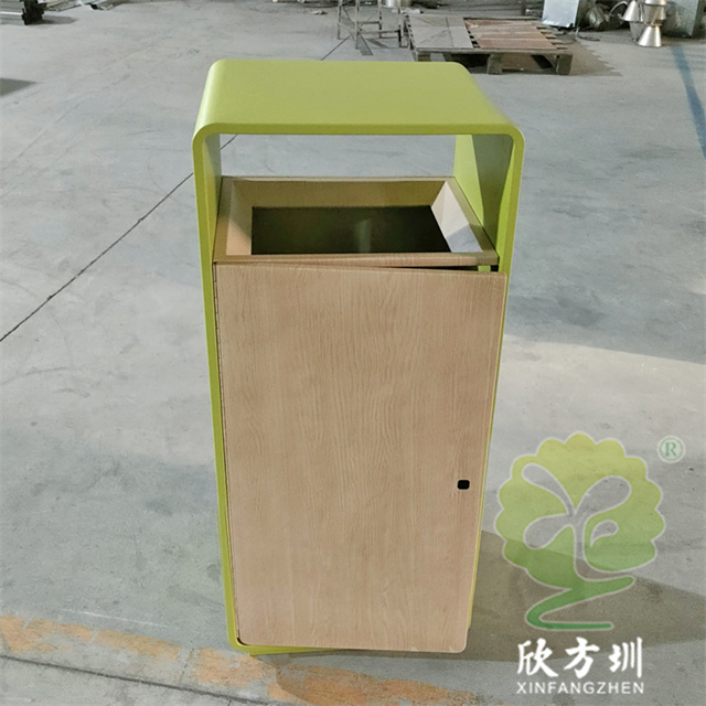室內(nèi)戶外轉木紋方形不銹鋼垃圾桶采用了304不銹鋼板制造而成,方形雙面投口單筒設計,桶身框架采用了淡綠色噴涂噴塑上色,框架板材雙層折彎更佳耐用,桶身雙面門板采用了轉木紋工藝制作,內(nèi)筒可以使用三角鑰匙打開門板取出內(nèi)置的內(nèi)筒,正反面絲網(wǎng)印刷了白色的其他垃圾最新國標,可以定制雙分類或者多分類的桶。