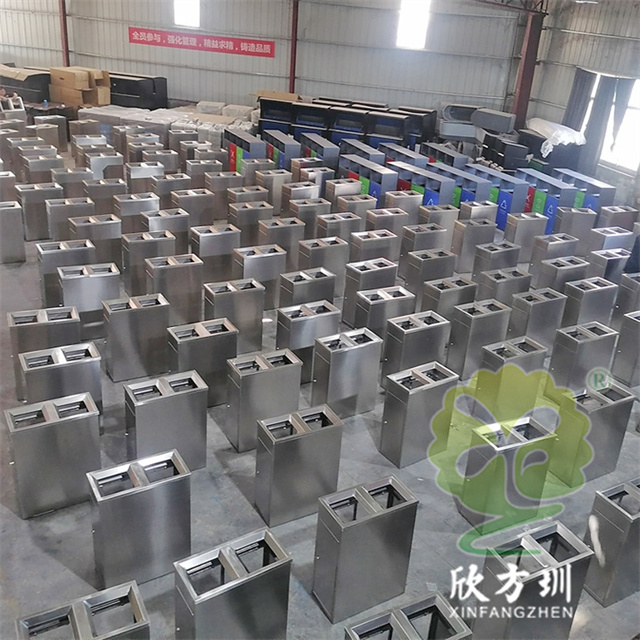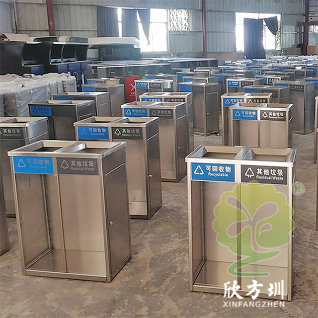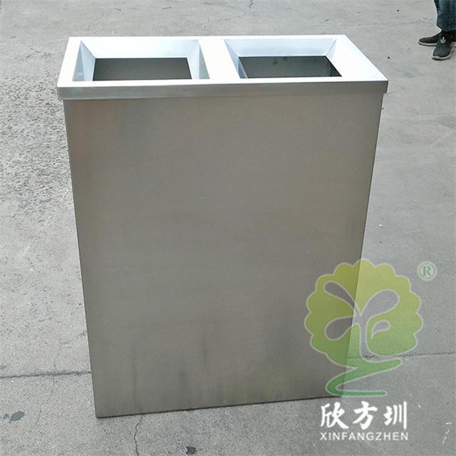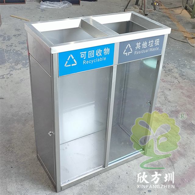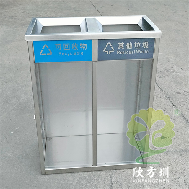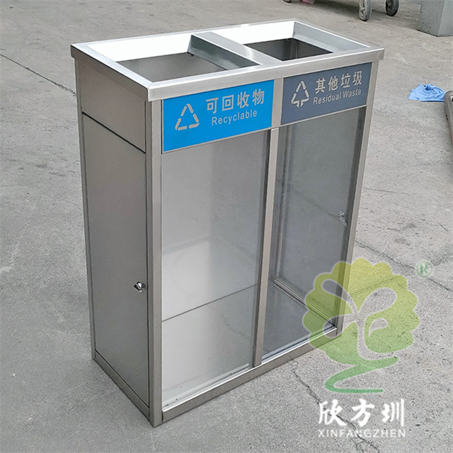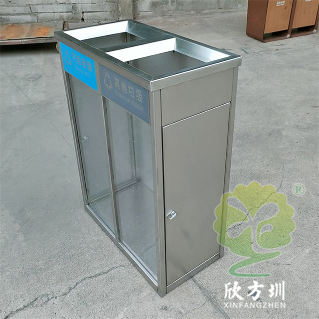 室內(nèi)兩連體防爆透明不銹鋼分類垃圾桶整體材質(zhì)采用了1.5mm厚(足1.42mm)生產(chǎn),直投口立式方形兩連體分類設(shè)計(jì),表面不銹鋼本色啞光,正面上方橫條油墨絲印可回收物和其他垃圾國(guó)標(biāo)分類標(biāo)識(shí),左右兩邊使用了扭鎖方便取出垃圾袋,無(wú)需要內(nèi)筒直接套塑料透明垃圾袋使用,桶底部加四個(gè)腳膠墊這樣有效避免挪動(dòng)發(fā)出聲響。