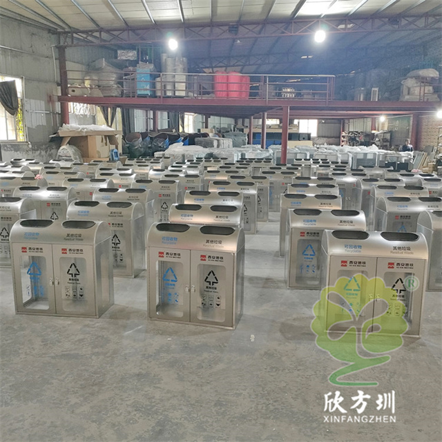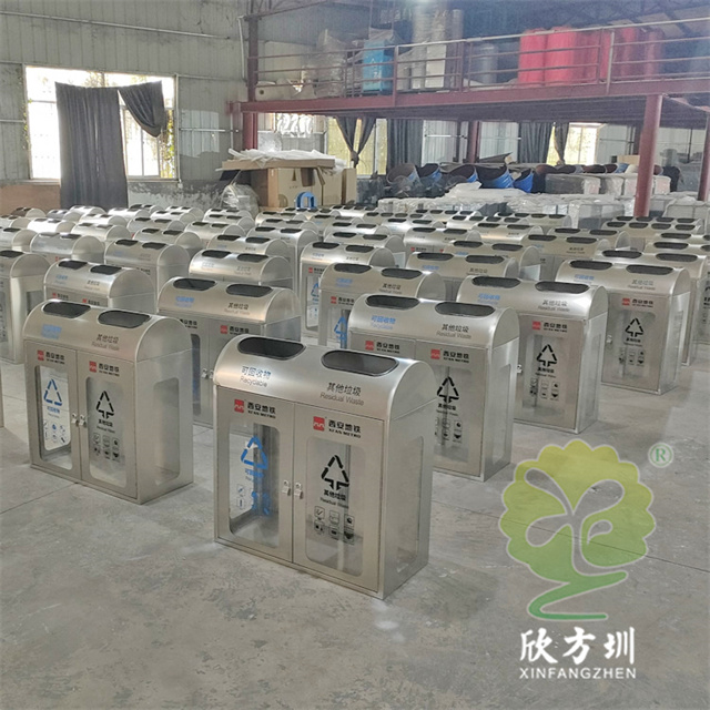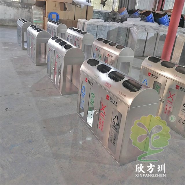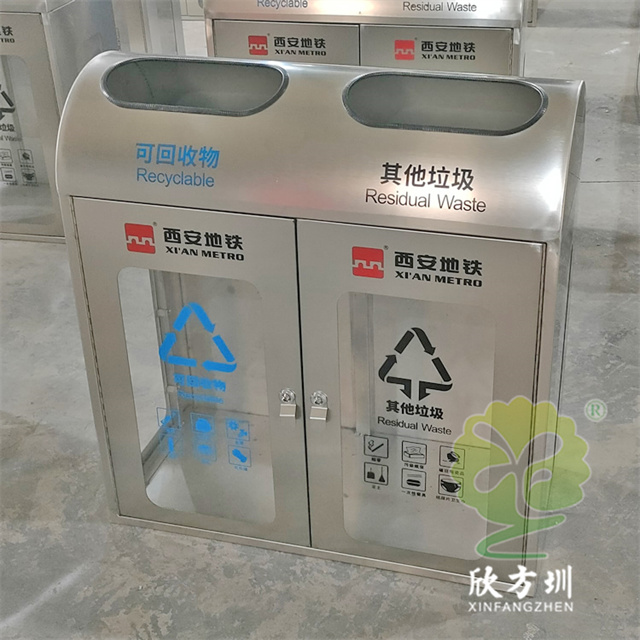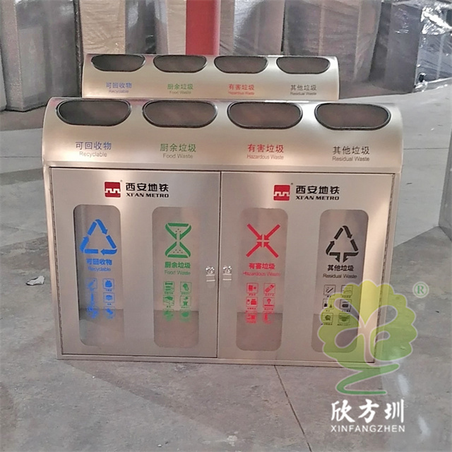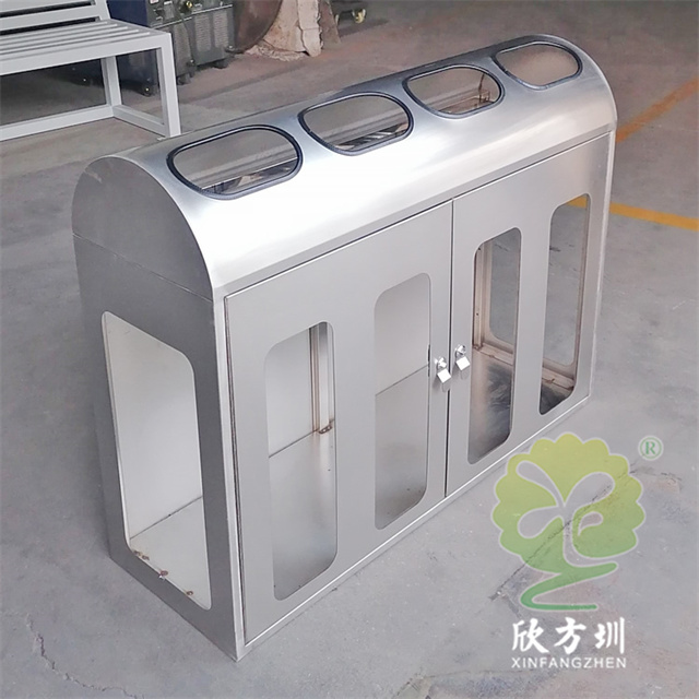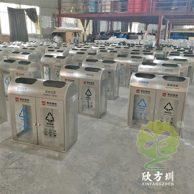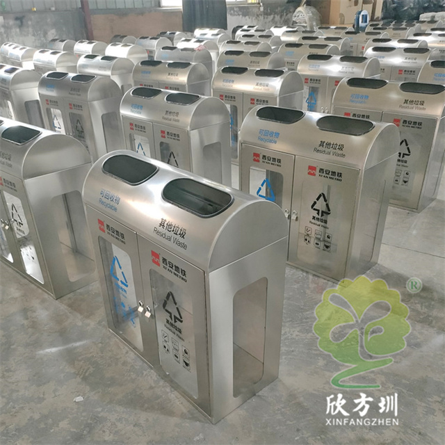陜西透明防爆不銹鋼分類垃圾桶外筒201不銹鋼,1.2mm厚度(足1.12mm)用戶定制了兩種規(guī)格兩分類和四分類的,這款果皮箱不含內(nèi)筒,桶身正面開(kāi)門,正面和兩個(gè)側(cè)面有透明亞克力板4mm厚度(足3.75mm),桶身正面絲印分類標(biāo)識(shí)和西安地鐵的LOGO,投口粘黑色膠條有效防止割到手,可以打木架或者紙箱包裝,帶導(dǎo)軌和彈簧。