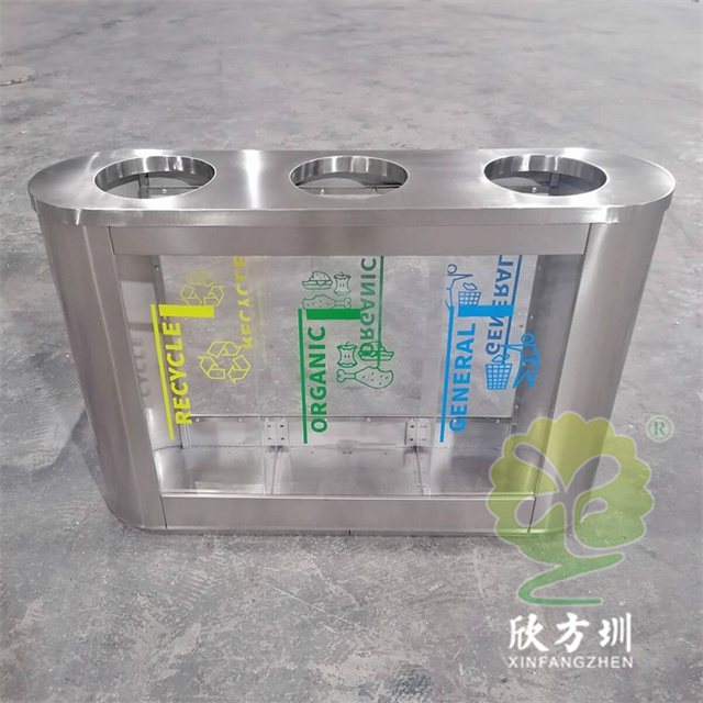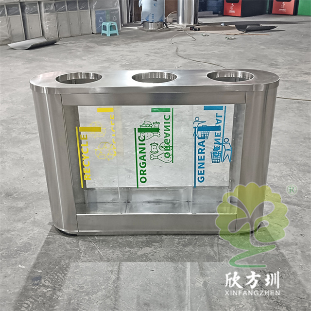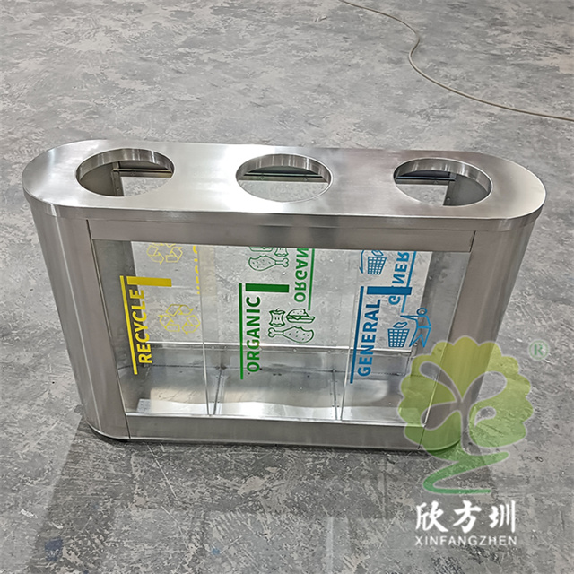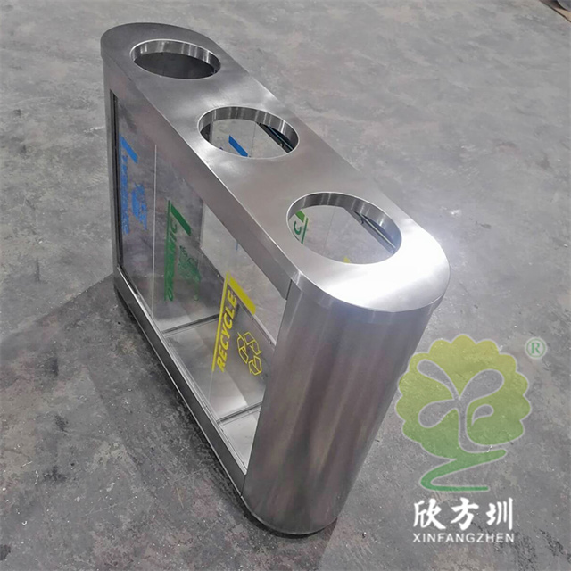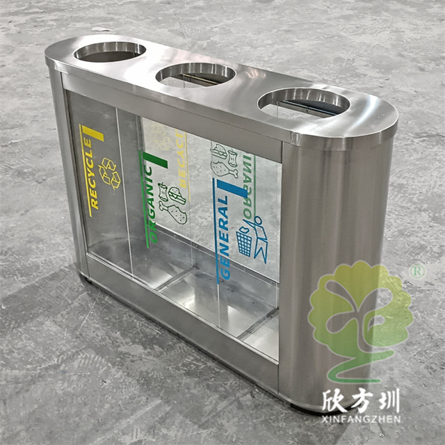 外貿(mào)室內(nèi)環(huán)衛(wèi)透明三分類不銹鋼垃圾桶可以采用201或者304不銹鋼板制作,橢圓形直投口三分類設(shè)計(jì),透明部位可以采用亞克力板或者鋼化玻璃制作,投口帶不銹鋼鋼管壓垃圾袋,透明板可以絲網(wǎng)印刷中英文分類標(biāo)識,支持定制兩分類四分類顏色尺寸或帶漏水槽,無內(nèi)筒套透明塑料垃圾袋,便于環(huán)衛(wèi)工人進(jìn)行垃圾清倒,適合擺放場景:室內(nèi)機(jī)場候機(jī)廳、高鐵站候車廳、購物商場、地鐵站等等。