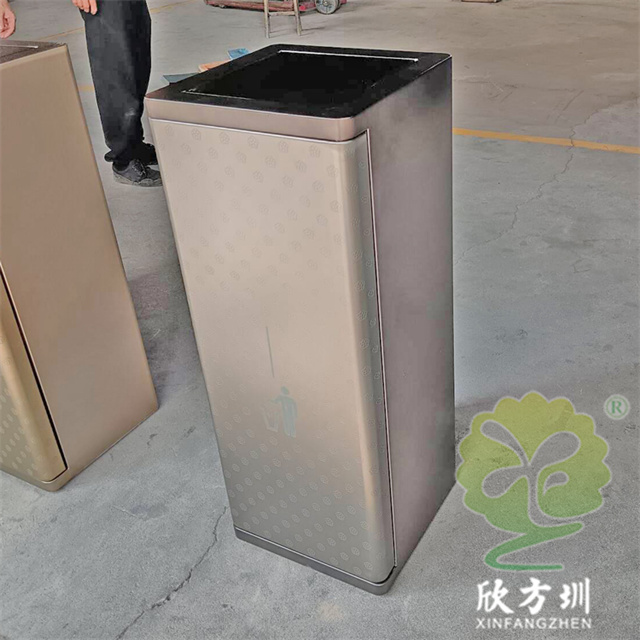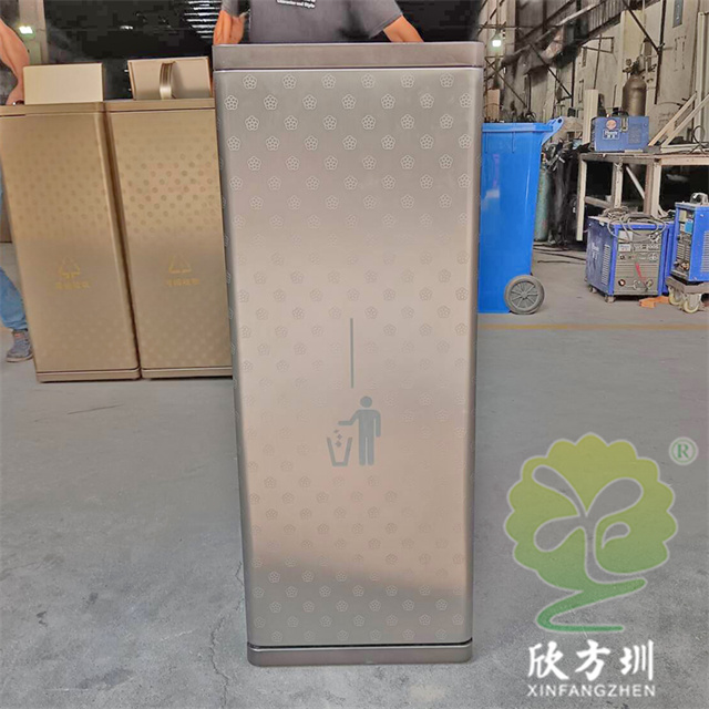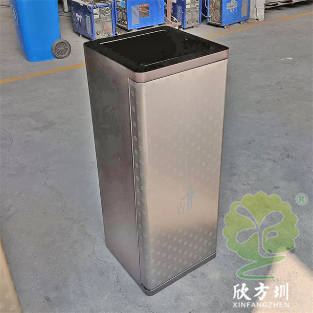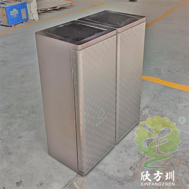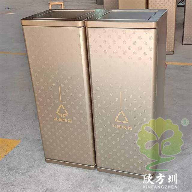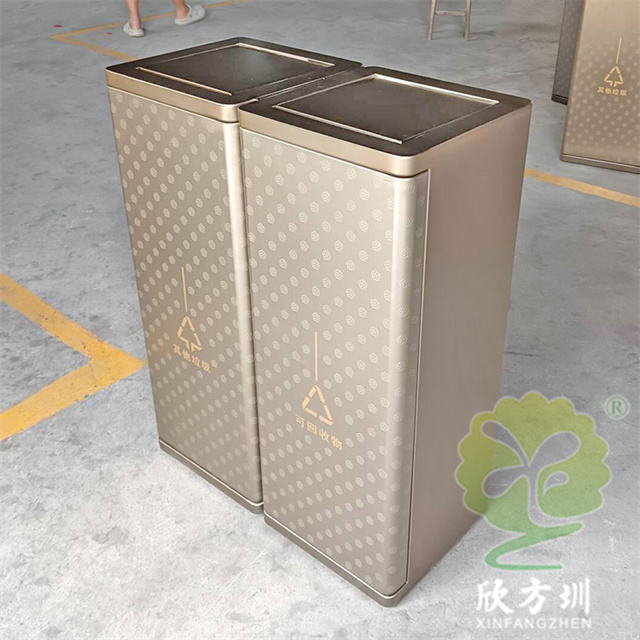 室內(nèi)電鍍腐刻不銹鋼分類垃圾桶單筒可以采用201/304不銹鋼板制造,兩個款式一款是單筒一款是兩分類方形帶搖擺蓋設(shè)計,雙筒用8*8mm方通相連,門板腐刻印花工藝,不銹鋼金屬表面做了電鍍黑鈦和香檳金工藝,正面抽拉式導(dǎo)軌抽可以取出內(nèi)膽,門板中心位置絲網(wǎng)印刷最新中英文國標(biāo)分類標(biāo)識或人頭標(biāo)。