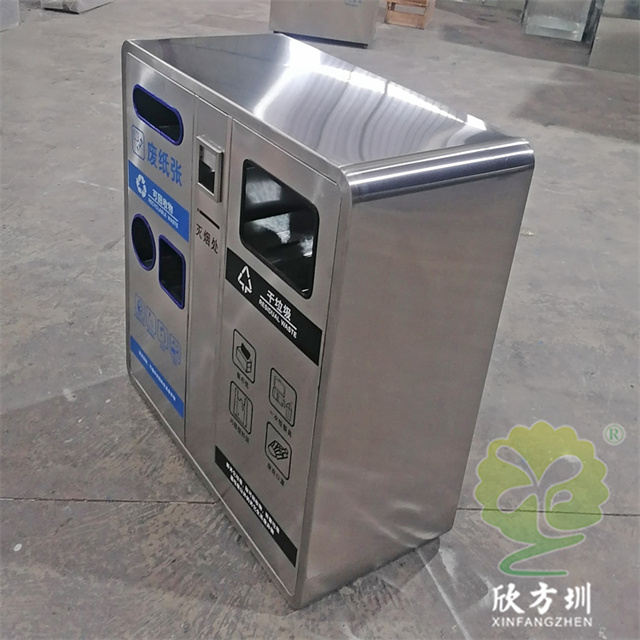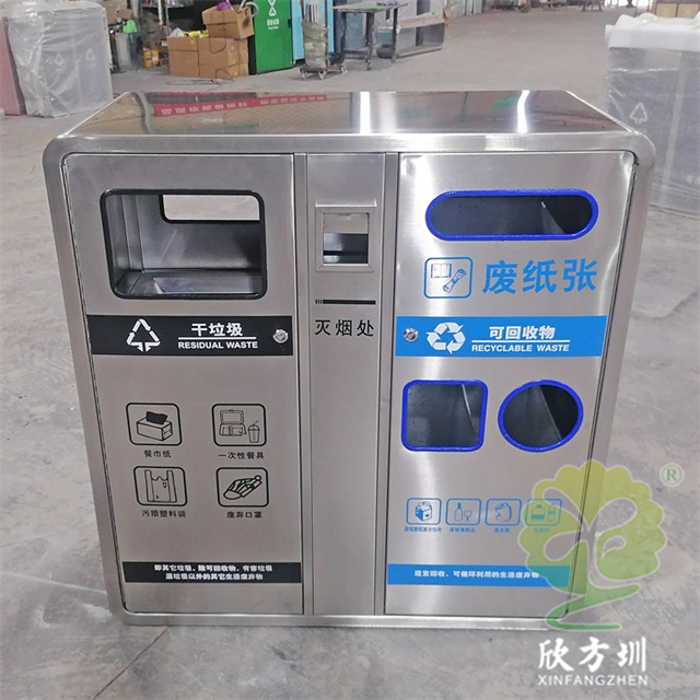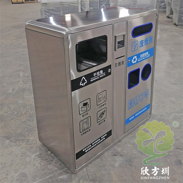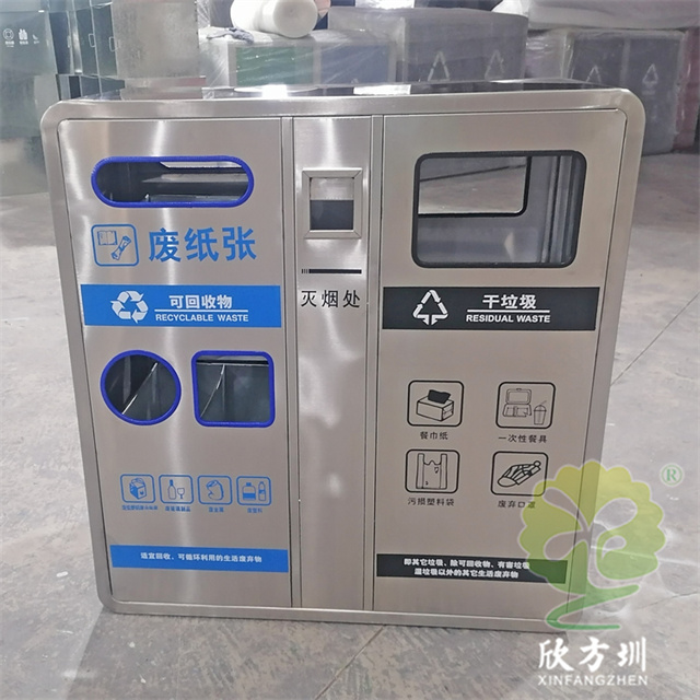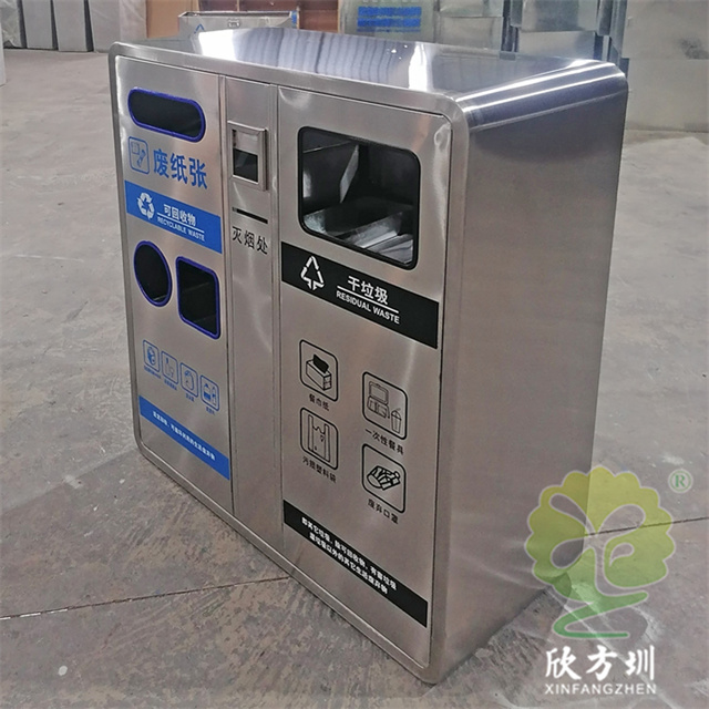 戶外大容量城市街道不銹鋼分類垃圾桶可以采用201/304不銹鋼板制造,表面烤漆噴塑了就可以做鍍鋅板材質(zhì)的,雙面可回收物多個(gè)投口設(shè)計(jì),有長(zhǎng)方形廢報(bào)紙、方形投口、圓形塑料瓶投口,方形干垃圾投口,投口膠條封邊防止割手,中間位置帶滅煙盒,投口顏色可以定制。
