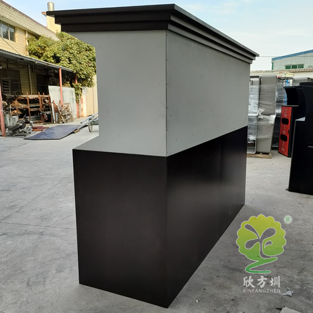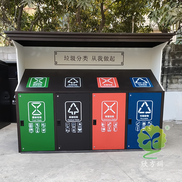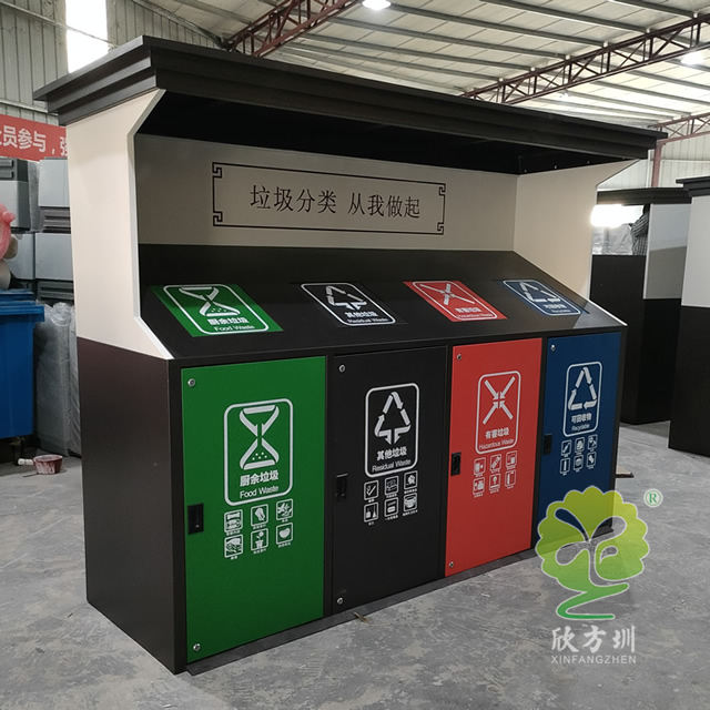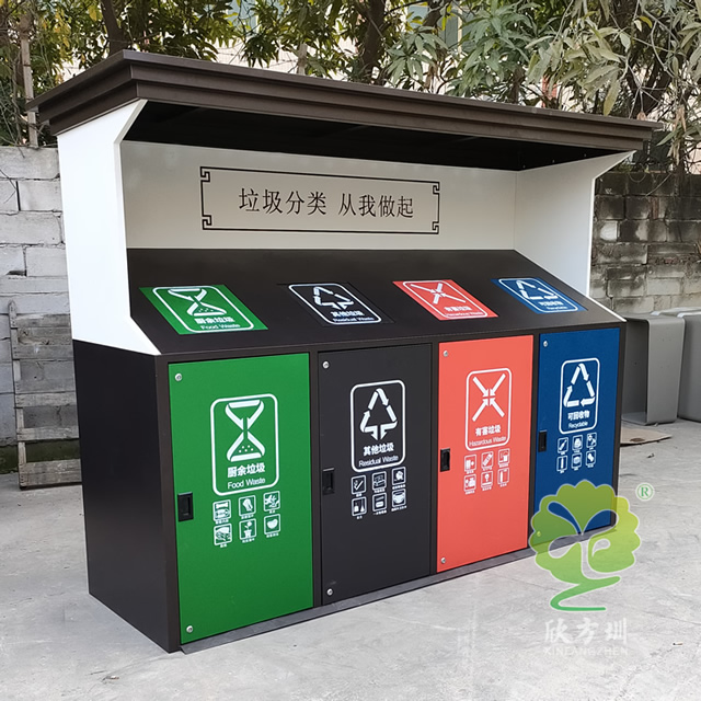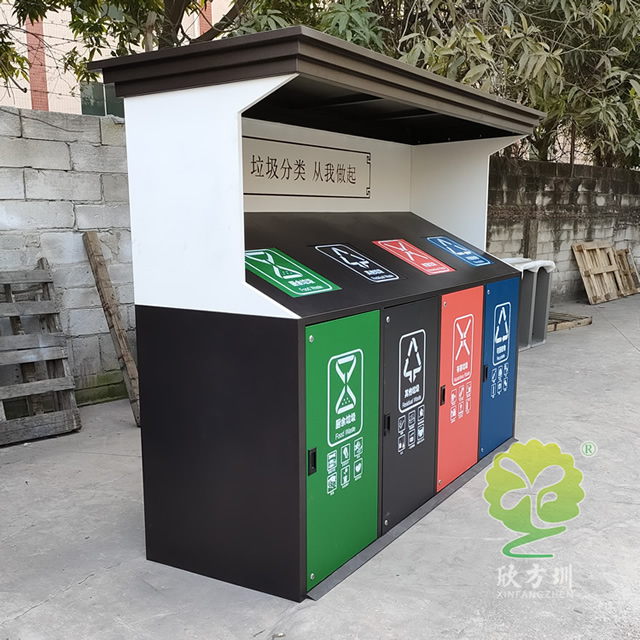 城市道路小區(qū)鍍鋅板四分類垃圾亭采用了鍍鋅板制作而成,四分類屋形設(shè)計,桶身采用了噴塑黑白配色,桶蓋和門板四色噴塑分別廚余垃圾綠色噴塑、其他垃圾黑色噴塑、有害垃圾紅色噴塑、可回收物藍(lán)色噴塑,桶蓋和門板油墨絲網(wǎng)印刷了最新的國標(biāo)分類標(biāo)識,正面亭子中心印刷了垃圾分類從我做起。