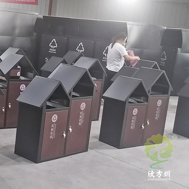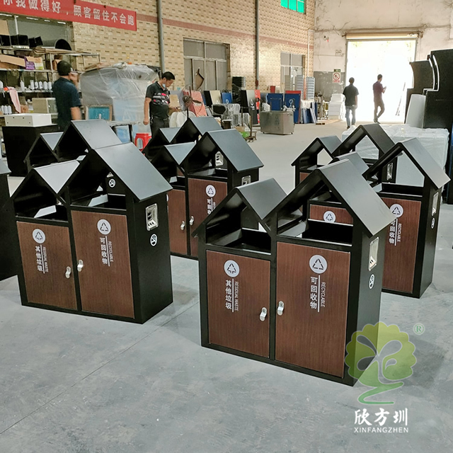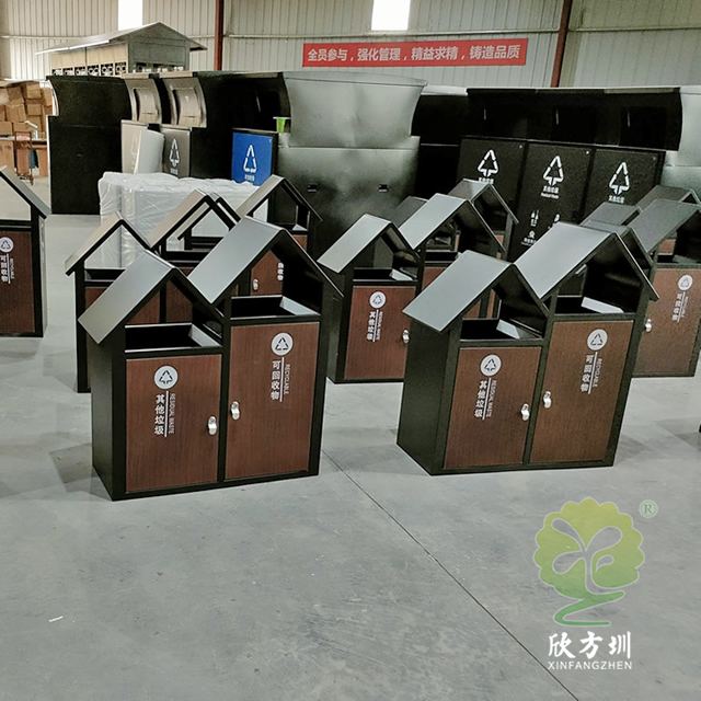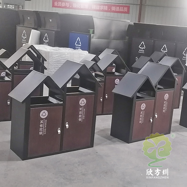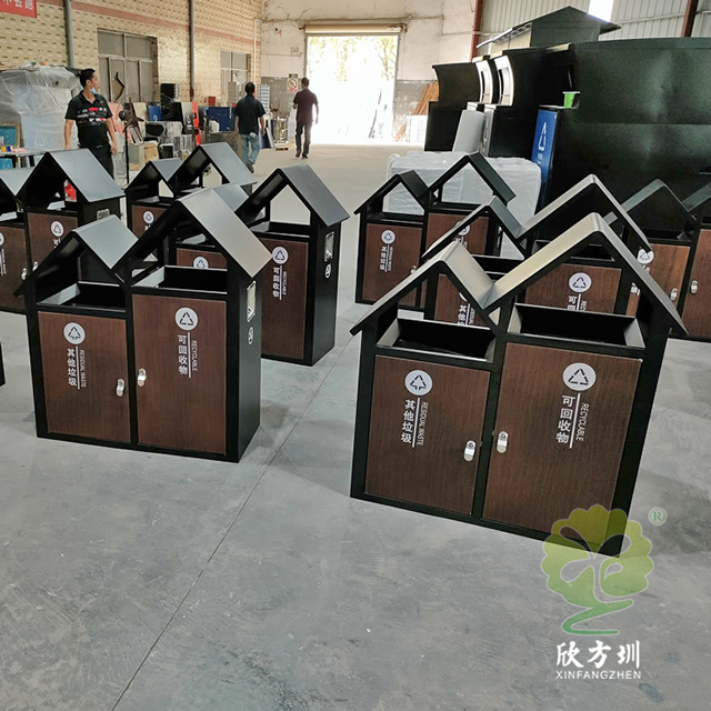 公園景區(qū)屋形分類垃圾箱采用了全新優(yōu)質(zhì)1.0mm厚冷軋鋼板制造而成,兩分類連體尖頂屋形設(shè)計(jì),整體垃圾桶框架黑色噴涂噴塑,正面推拉門板仿轉(zhuǎn)木紋效果,門板油墨絲印了新國標(biāo)其他垃圾、可回收物分類標(biāo)識(shí),三角鑰匙開門方便取出內(nèi)置的內(nèi)筒,可回收箱側(cè)面上方帶一個(gè)滅煙盒。