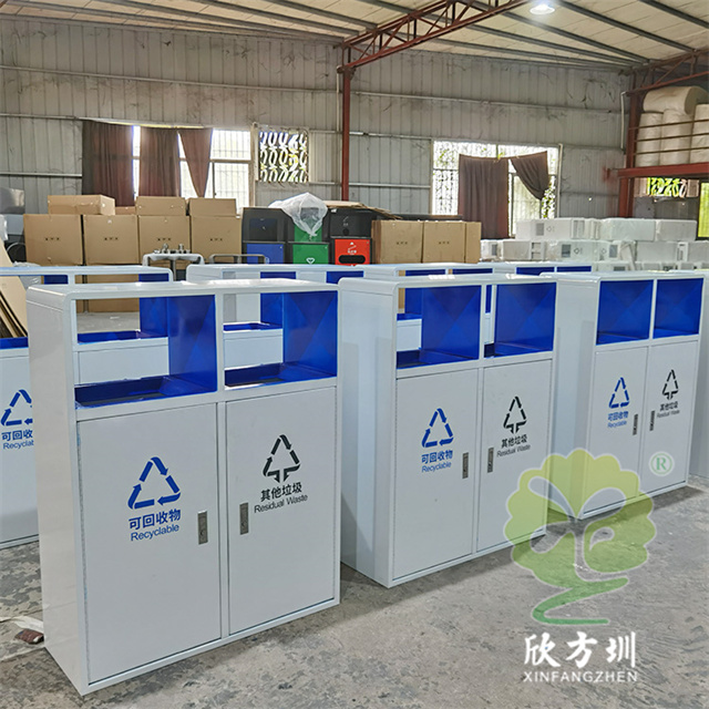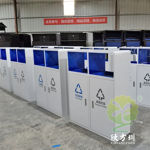 戶外方形烤漆白色鍍鋅板分類垃圾桶采用了1.00mm厚的鍍鋅板制作而成,雙面投口方形兩連體分類設(shè)計(jì)簡(jiǎn)潔大氣,兩面絲網(wǎng)印刷了其他垃圾和其他垃圾的最新國(guó)標(biāo)分類標(biāo)識(shí),開門方式采用了磁吸方式推拉無(wú)需三角鑰匙, 我們廠家支持冷軋鋼板、不銹鋼、表面電鍍、烤漆、噴塑上色定制,每個(gè)城市都有每一個(gè)城市垃圾桶設(shè)計(jì)方案。
