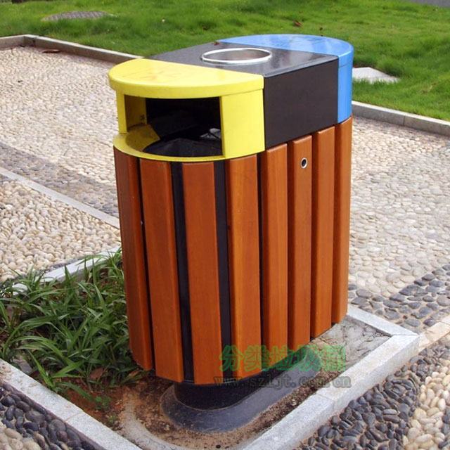 【產(chǎn)品顏色】:以山樟木的原色黃色為主色,覆蓋于桶身;垃圾桶的邊緣的鋼板立柱使用黑色;桶蓋適用黃黑藍(lán)三色,顏色對(duì)比鮮明和諧,簡(jiǎn)潔大方,實(shí)用美觀,還可根據(jù)客戶需求定制。